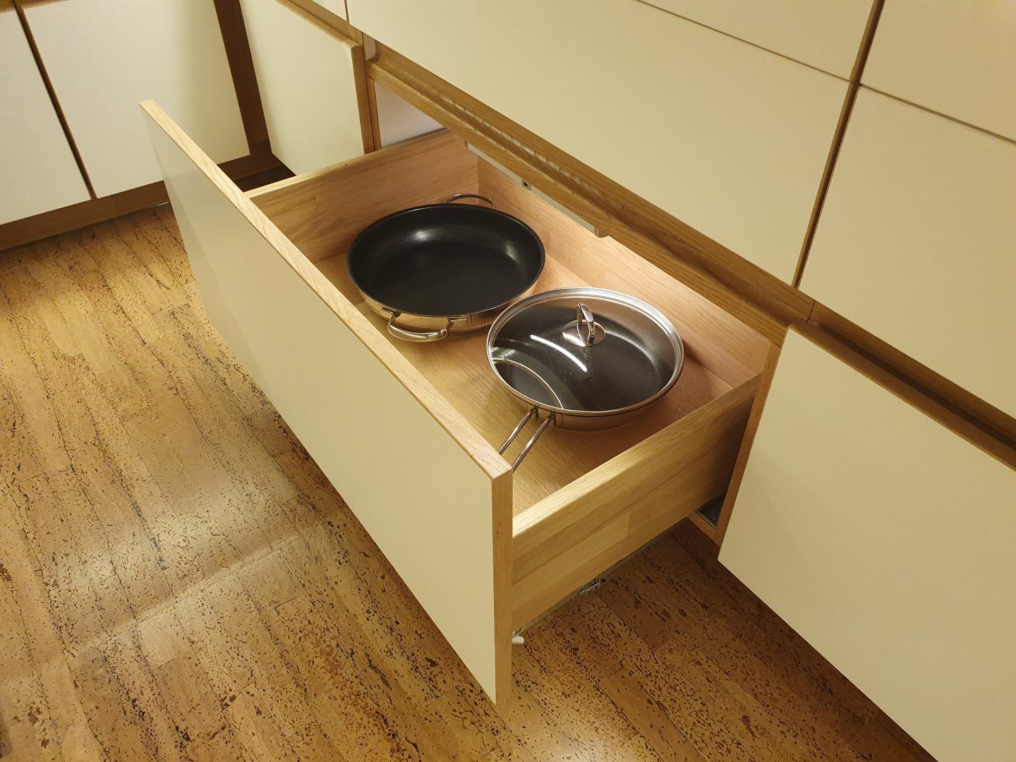 Für die Fronten wurde eine hochwertige NonTouch-Oberfläche in freundlichem, gedecktem Weiß gewählt. Die Art der Oberfläche ist auch von Vorteil, weil die Türen und Schubläden durch Push-up geöffnet werden und dank der Oberflächenqualität keine Fingerabdrücke entstehen. Diese Technologie wurde vor allem deshalb gewählt, weil tiefer liegende Griffleisten Stauraum reduzieren und Griffe die Gesamtfläche unruhig wirken lassen würden.
