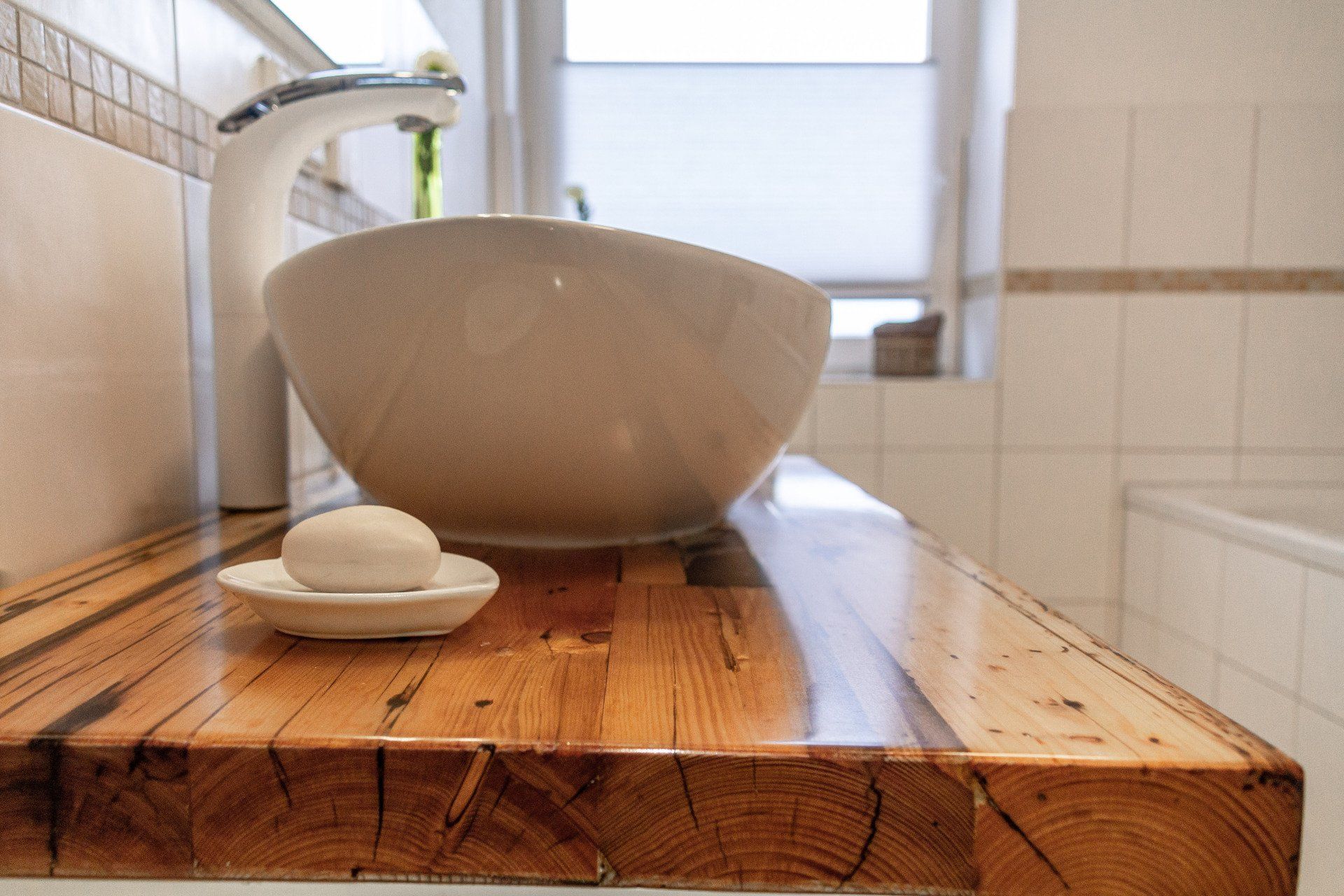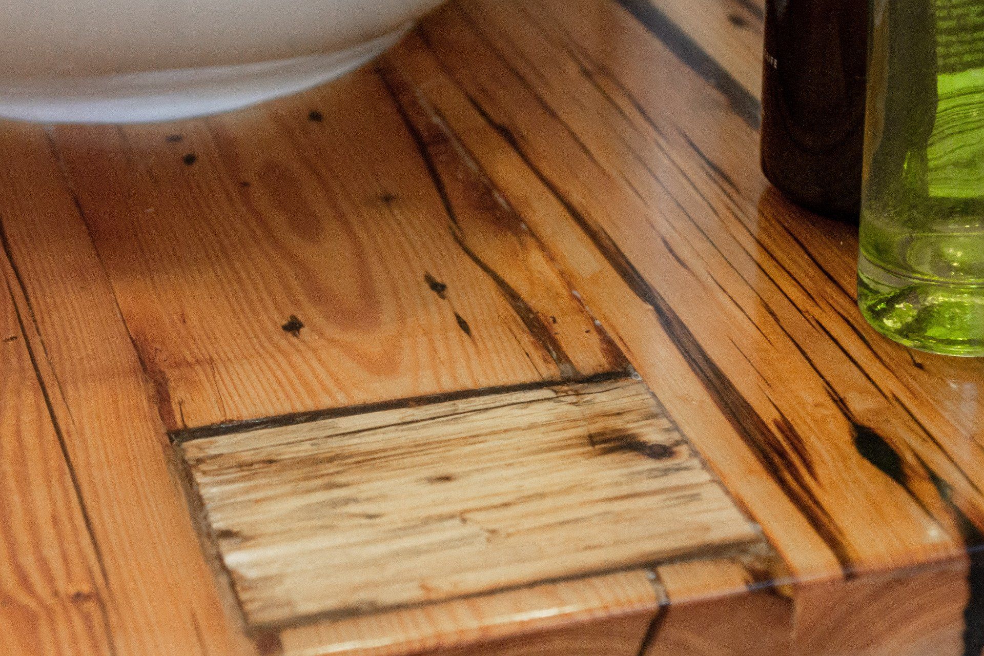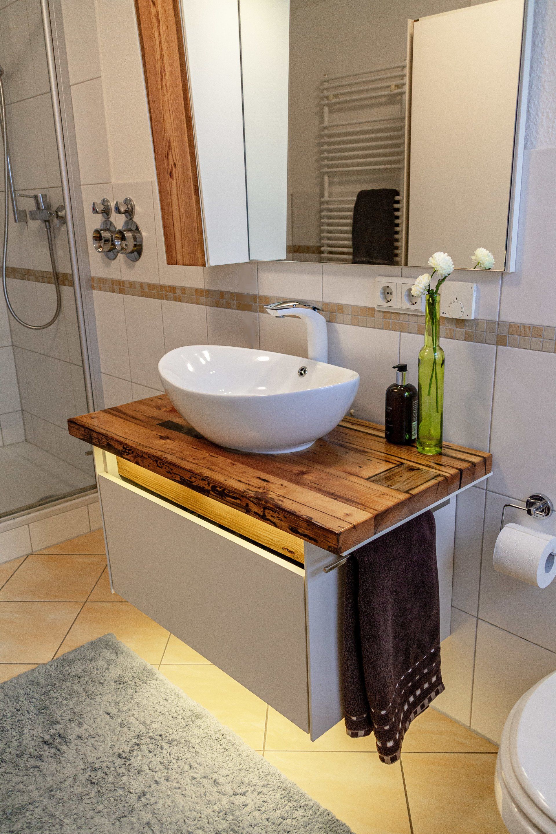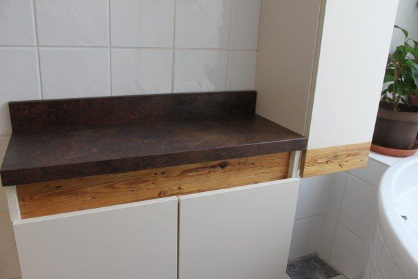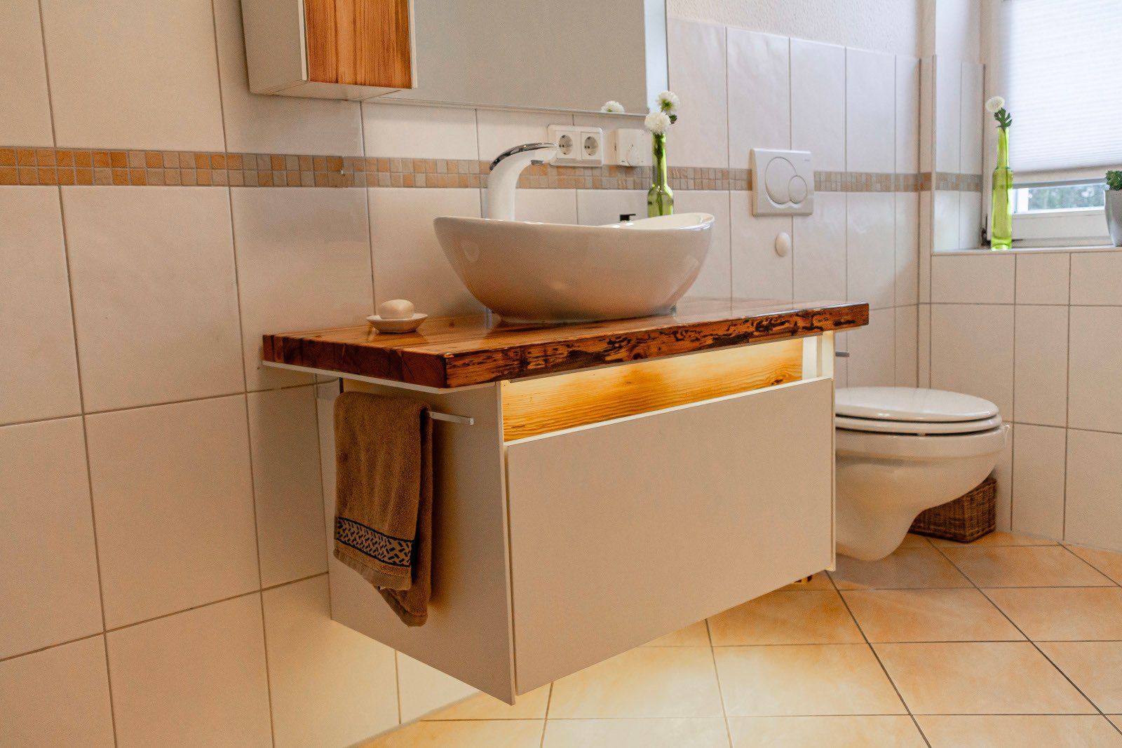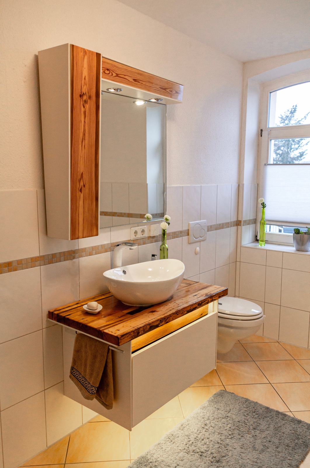 Bestimmende Komponenten sind das alte Holz und die rostfarbigen Platten. Zentrales Element ist der Waschtisch mit seinen warmen Tönen, die von dem 200 Jahre alten Holz bestimmt sind. Der Rost-Ton harmoniert dabei perfekt mit dem Altholz vom Waschtisch und den Sideboards. Gleichzeitig ist der Rost-Ton mit dem warmen Ton das optisch verbindende Element der gegenüberliegenden Seiten.