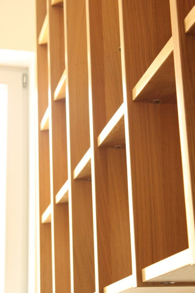 Die Fächer haben eine Breite von ca. 30cm, ein Maß, welches das Regal zu einem Möbel macht, das nicht von den Büchern beherrscht wird, sondern die Bücher strukturiert und für das Auge symetrisch ordnet. Die Materialstärke von 26mm (Böden) und 29 mm (Aufrechten) vermitteln eine gehobene Wertigkeit. Das Verhätnnis von Breite und Höhe der Fächer ist dem Goldenen Schnitt entlehnt.