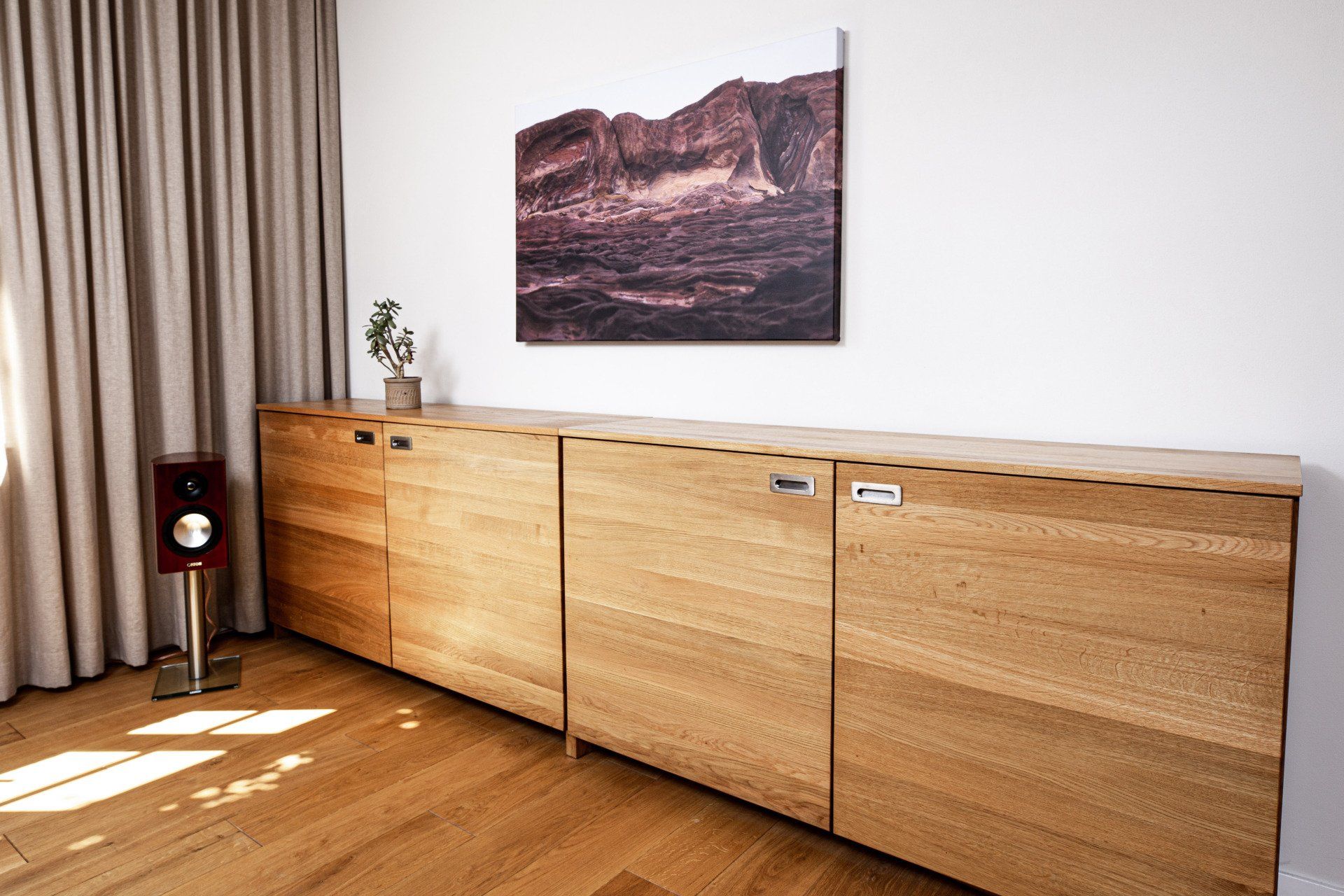 Die Sideboards haben eine Gesamtlänge von 3,2m. Bei dieser großen Gesamtlänge besteht immer die Gefahr, dass die Front durch viele Türen und Schubkästen sehr zerklüftet wirkt. Deshalb wurden großformatige Türen gewählt, die den optischen Fluss der Maserung nicht unterbrechen und damit Ruhe ausstrahlen. Damit der edle Eindruck der Front auch nicht durch versetzte Schiebetüren unterbrochen wird, wurden flächenbündige Türbeschläge verbaut, die sich beim Öffnen vorziehen und dann gedämpft zur Seite schieben lassen. Handwerkliche Herausforderung war es, alles in Vollholz zu fertigen. Die Türen mussten in ihrer Größe durch Gratleisten gegen Verwerfung und Verzug gesichert werden, was bei der engen Bauweise des Schiebetürbeschlages kompliziert war.