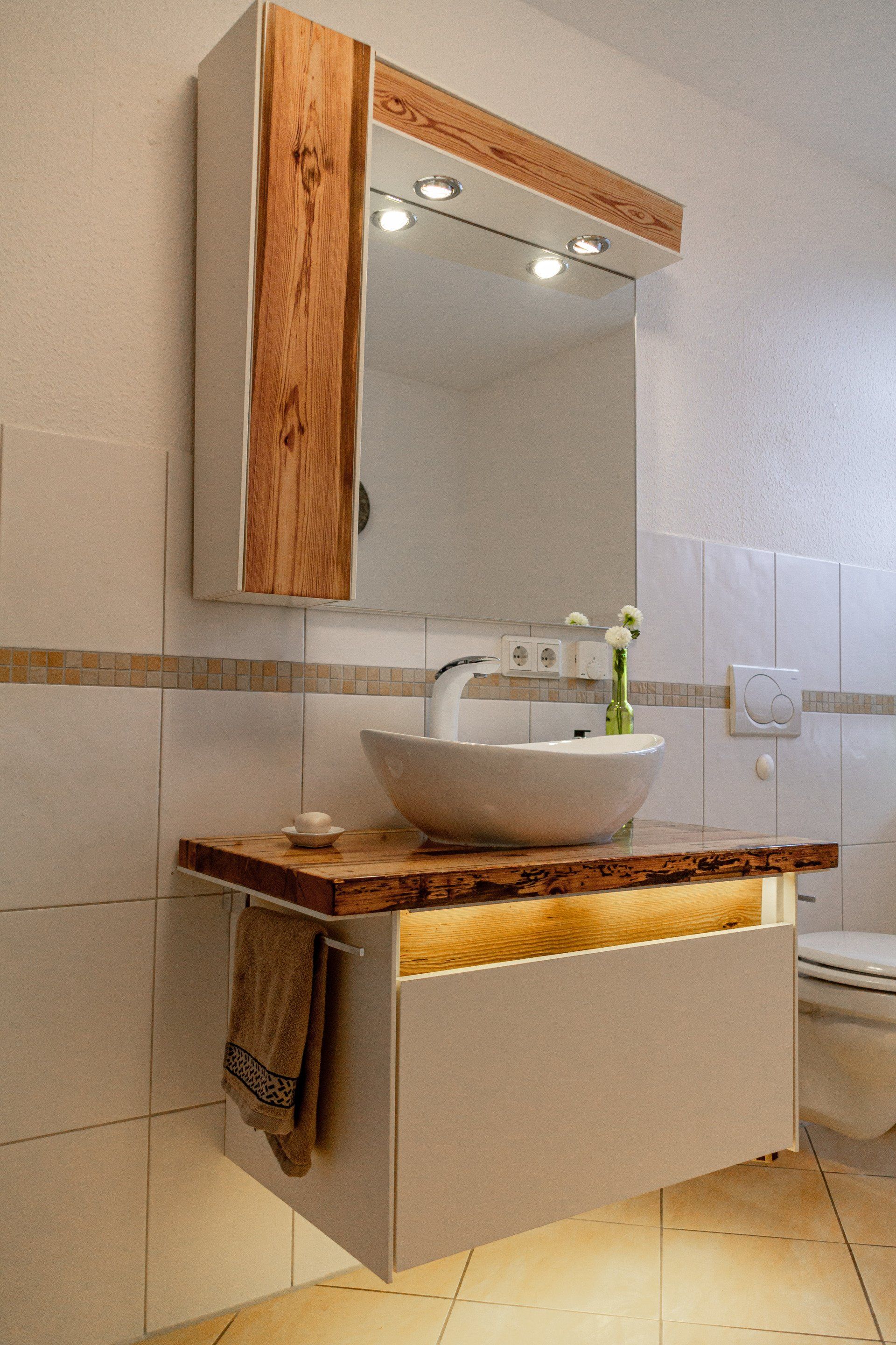 Bestimmende Komponenten sind das alte Holz und die rostfarbigen Platten. Zentrales Element ist der Waschtisch mit seinen warmen Tönen, die von dem 200 Jahre alten Holz bestimmt sind. Der Rost-Ton harmoniert dabei perfekt mit dem Altholz vom Waschtisch und den Sideboards. Gleichzeitig ist der Rost-Ton mit dem warmen Ton das optisch verbindende Element der gegenüberliegenden Seiten.
