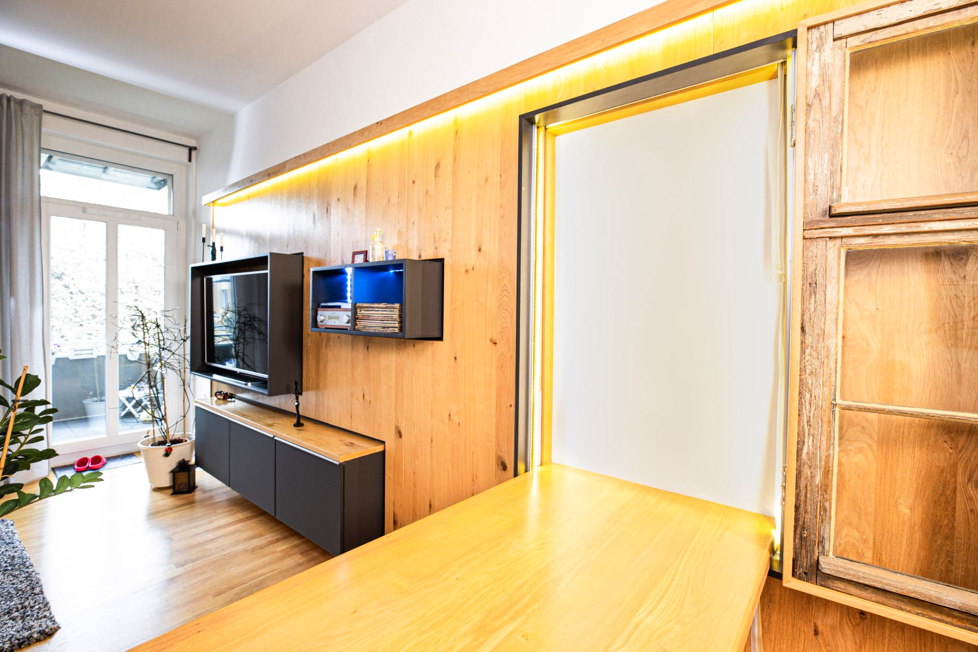 Die Funktionselemente in der Wandverkleidung setzen sich durch anthrazitfarbige Kästen ab. Diese Oberflächen sind durch eine One-Touch-Beschichtung sehr pflegeleicht. Der Klapptisch in Kombination mit dem vorgeblendeten alten Fenster wird zum Highlight der Vertäfelung. Die Lichtreflektion auf der warmen Eiche-Oberfläche gibt eine anheimelnde und entspannende Wirkung für Abende auf der Couch.